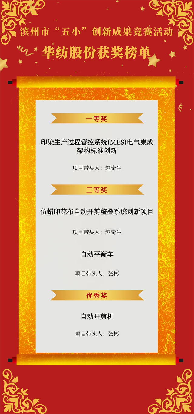 近日,市總工會開展的濱州市“五小”創(chuàng)新成果競賽活動(dòng)獲獎(jiǎng)名單公布,公司申報(bào)的4項(xiàng)“五小”競賽創(chuàng)新成果喜獲殊榮,其中,《印染生產(chǎn)過程管控系統(tǒng)(MES)電氣集成架構(gòu)標(biāo)準(zhǔn)創(chuàng)新》獲一等獎(jiǎng),《仿蠟印花布自動(dòng)開剪整疊系統(tǒng)創(chuàng)新項(xiàng)目》《自動(dòng)平衡車》獲三等獎(jiǎng),《自動(dòng)開剪機(jī)》獲優(yōu)秀獎(jiǎng)。
